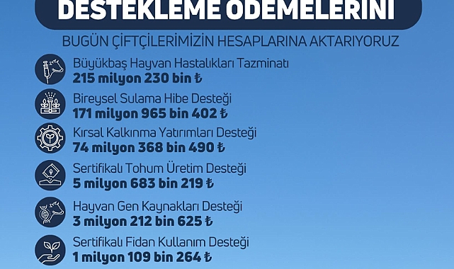 Tarım ve Orman Bakanlığı, üreticinin emeğine sahip çıkan ve alın terini berekete dönüştüren destek ödemelerine bir yenisini daha ekledi. Toplam 471 milyon 569 bin TL tutarındaki tarımsal destek ödemesi, bugün itibarıyla çiftçilerin hesaplarına aktarılmaya başlandı.