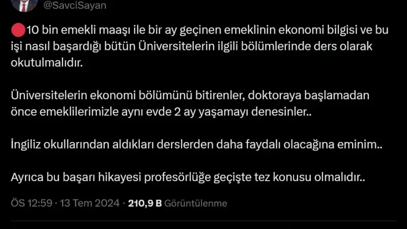 10 bin emekli maaşı ile bir ay geçinen emeklinin ekonomi bilgisi ve bu işi nasıl başardığı bütün Üniversitelerin ilgili bölümlerinde ders olarak okutulmalıdır. Üniversitelerin ekonomi bölümünü bitirenler, doktoraya başlamadan önce emeklilerimizle aynı evde 2 ay yaşamayı denesinler.. İngiliz okullarından aldıkları derslerden daha faydalı olacağına eminim.. Ayrıca bu başarı hikayesi profesörlüğe geçişte tez konusu olmalıdır..