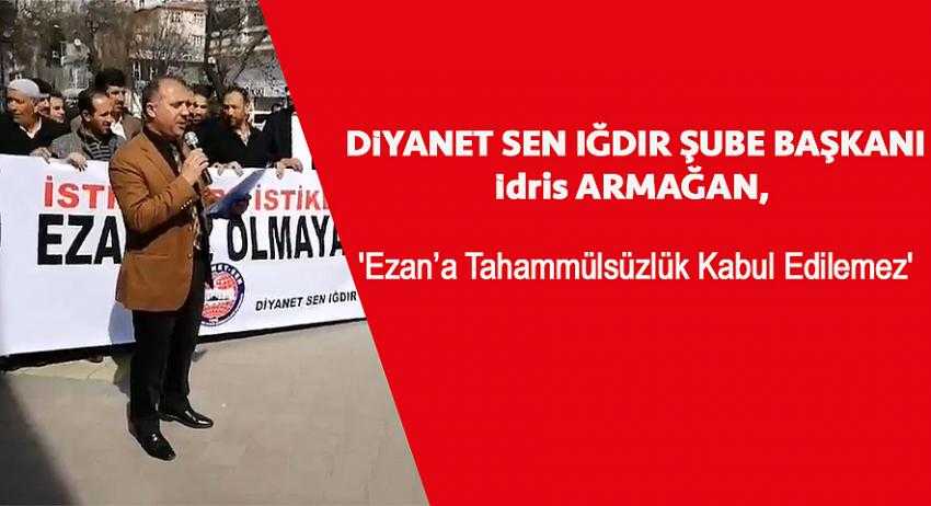 Burada açıklamalarda bulunan Diyanet Sen Iğdır Şube Başkanı İdris ARMAĞAN, "8 Mart Dünya Kadınlar Günü nedeniyle Taksim'de bir araya gelen kadın gruplar yürüyüş düzenledikleri esnada yatsı ezanının okunmasını ıslıkları ile protesto ederek Müslüman bir ülkede kesinlikle olmaması gereken bir densizliğe imza atmışlardır. Bin yıldan uzun süredir İslam’ın bayraktarlığını yapan bir ülkede ezan sesini protesto etme cüretini göstermek ülke insanımıza ve tüm dünya Müslümanlarına yapılmış bir saygısızlıktır. Ezan sesi üzerinden yapılan bu tahammülsüzlük kesinlikle kabul edilemez. Halkı provoke etme amaçlı bu protestoyu gerçekleştirenler derhal büyük çoğunluğu Müslüman olan Türkiye halkından ve tüm dünya Müslümanlarından özür dilemeli haklarında halkı kin ve düşmanlığa sevk etmekten gerekli yasal işlemler başlatılmalıdır. Selçuklu, Osmanlı ve Türkiye Cumhuriyeti ile birlikte yüzyıllar boyunca bir çok inanç ve kültüre sahip insanlarla birlikte kardeşçe yaşamayı başarmış, diğer inanç sahiplerine saygıda kusur etmemiş bir halkın bu gün kendi ülkesinde ezanına tahammül edilememesi üstelik de bu tahammülsüzlüğün protesto ile gösterile bilmesi bizlerinde tahammül sınırlarını zorlamaktadır. Ezanımıza yapılan saygısızlığa seyirci kalmayacağız. İslami değerlerimize saldırı halinde olan, insanlar arasında kin ve düşmanlığı alenen tahrik etme ve kamu barışını bozma amacıyla yapılan bu protestoyu inanç özgürlüğü çerçevesinde değerlendirmemiz mümkün değildir.Türkiye her dinden-inançtan insanların yaşadığı geniş bir mozaiktir. Saygı ve kardeşlik düsturuyla hareket ederken, toplumu kutuplaşmaya götüren bu tür girişimler özellikle son zamanlarda İslam ve Müslümanlar üzerine oynanan oyunlar da göz önünde bulundurduğumuzda, maalesef bu olayın tamamen bilinçli ve kurgulanmış bir durum olduğunu müşahade ediyor ve kesinlikle olayı sonuna kadar takip edeceğimizin bilinmesini istiyoruz. Birlik ve beraberliğe en çok ihtiyaç duyduğumuz şu günlerde Müslümanları namaza çağıran evrensel mesaj ezan sesini protesto etmek toplumumuzdaki kardeşlik duygularını yıkmaya yönelik birlik ve beraberliğimizin çimentosu dinimiz ve ezanımız üzerinden ayrılık tohumları ekmeye çalışmaktır. Aziz milletimiz bu tür oyunları gayet iyi bilmektedir. Kimse bu oyunlara prim vermemeli sağduyu ile hareket etmeye devam etmelidir. Kimi zaman tahrik, kimi zaman siyasi dengeler nedeniyle gerçekleştirilen bu tür provokatif girişimler karşısında Müslümanları sağduyulu davranmaya, tepkilerini hukuk ve İslam geleneğinin bizlere öğrettiği naiflik ölçülerinde göstermeye davet ediyorum. Diyanet-Sen olarak hukuk çerçevesinde 85 Bin üyemizle bu olayın takipçisi olacağımızdan kimsenin kuşkusu olmasın." şeklinde konuştu.