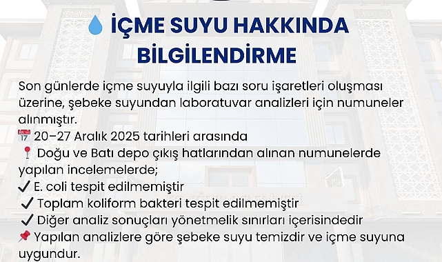 “Şebeke suyuyla ilgili vatandaşlarımızdan gelen geri bildirimler dikkate alınarak, 24 Aralık 2025 tarihinde hem doğu hem de batı Depo çıkış hatlarından ve ayrıca batı hattına bağlı bir hane ile doğu hattına bağlı İskender Caddesi güzergâhından numuneler alınmıştır.”