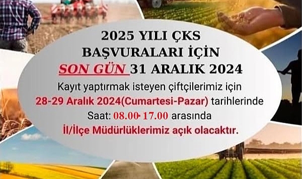 28-29 Aralık Cumartesi ve Pazar günleri ÇKS birimleri, çiftçilerin başvurularını tamamlayabilmeleri için mesai yapacak. İl Tarım ve Orman Müdürlüğü yetkilileri, başvurularını henüz tamamlamamış vatandaşları hafta sonu açık birimlere davet ederek herhangi bir mağduriyet yaşanmaması için çağrıda bulundu. Vatandaşlar İçin Büyük Kolaylık