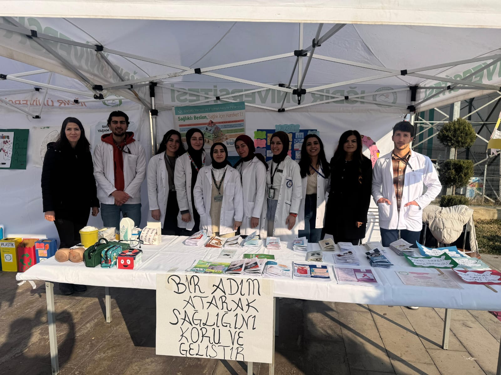 Dr. Öğr. Gör. Zeynep Yıldırım'ın koordinasyonunda, Hemşirelik Bölümü 4. sınıf öğrencileri ve öğretim elemanları tarafından yürütülen etkinlikte, "Bir Adım Atarak Sağlığını Koru ve Geliştir" başlığı altında çeşitli sağlık konularında bilgi verildi. Katılımcılara sağlıklı beslenme, fiziksel aktivite, düzenli uyku, stres yönetimi gibi konularda bilgilendirmeler yapıldı. Ayrıca, sigara, madde ve alkol kullanımı önleme, kronik hastalıklar ve sağlık taramaları hakkında da yönlendirmeler sağlandı.