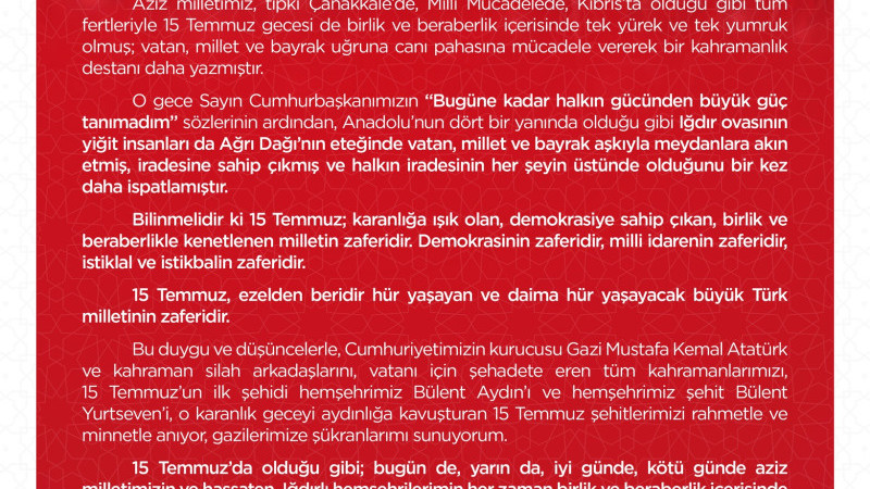 Iğdır Valisi Ercan Turan 15 Temmuz demokrasi ve milli birlik günü mesajı paylaştı devletimizin bekasına milletimizin birliğine ve beraberliğine karşı Fetullahçı terör örgütünün 15 Temmuz 2016 tarihind