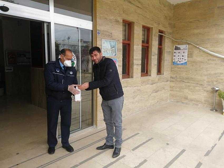 Görevli zabıta memuru vatandaşlara dezenfektan ilacı kullandırdıktan sonra belediye hizmet binasına geçişlerine izin verdi.
