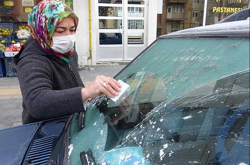 Araç camlarının buz tuttuğu kentte vatandaşlar araçlarını battaniye ve branda ile örterek soğuktan korumaya çalıştı.