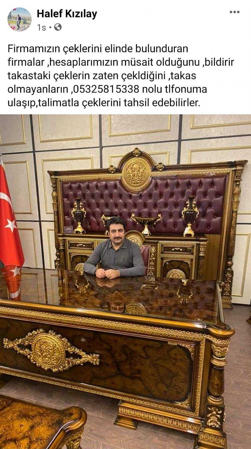 “Firmamızın çeklerini elinde bulunduran firmalar, hesaplarımızın müsait olduğunu, bildirir takastaki çeklerin zaten çekildiğini, takas olmayanların, 05325815338 No’lu telefonuma ulaşıp, talimatla çeklerini tahsil edebilirler.”