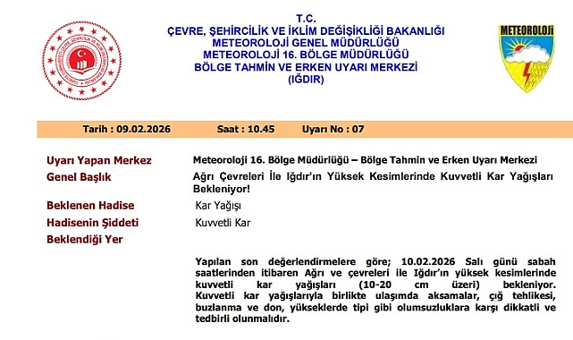 Meteoroloji 16. Bölge Müdürlüğü Bölge Tahmin ve Erken Uyarı Merkezi, Ağrı ve çevreleri ile Iğdır’ın yüksek kesimleri için kuvvetli kar yağışı uyarısında bulundu. Yapılan son değerlendirmelere göre, 10 Şubat 2026 Salı günü sabah saatlerinden itibaren bölgede etkili olması beklenen kar yağışının yer yer 10–20 santimetreyi aşabileceği bildirildi.