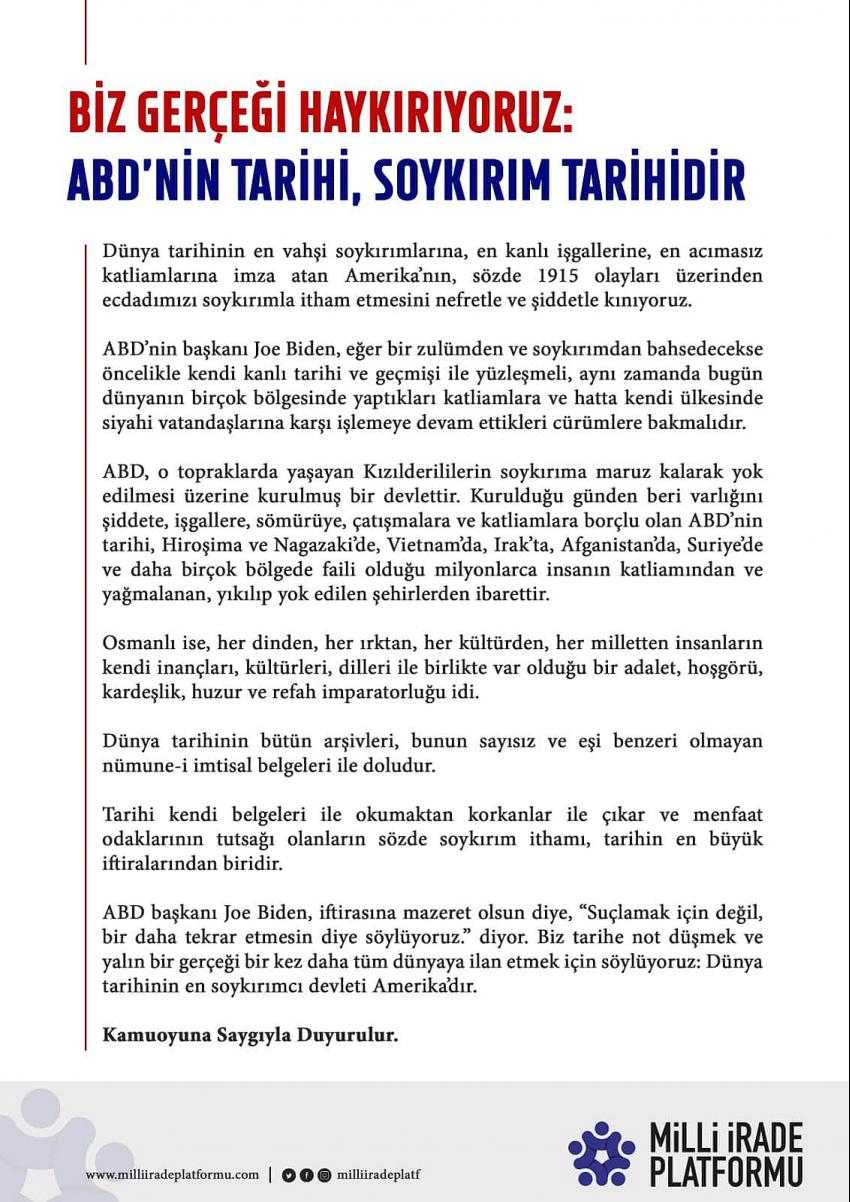 Yapılan yazılı açıklamada, ABD tarihinin soykırım tarihi olduğu ifade edilerek, “Dünya tarihinin en vahşi soykırımlarına, en kanlı işgallerine, en acımasız katliamlarına imza atan Amerika’nın sözde 1915 olayları üzerinden ecdadımızı soykırımla itham etmesini nefret ve şiddetle kınıyoruz” denildi.