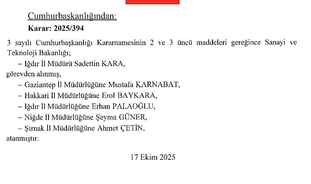 Cumhurbaşkanlığı tarafından yayımlanan 17 Ekim 2025 tarihli ve 33051 sayılı Resmî Gazete kararıyla, Iğdır Sanayi ve Teknoloji İl Müdürü Sadettin Kara görevden alındı. Kara’nın yerine Erhan Palaoğlu atandı.