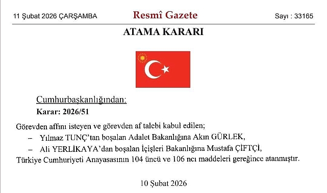 Cumhurbaşkanı Recep Tayyip Erdoğan’ın imzasıyla yayımlanan karara göre, Adalet Bakanı Yılmaz Tunç ve İçişleri Bakanı Ali Yerlikaya görevlerinden ayrıldı. Adalet Bakanlığı görevine İstanbul cumhuriyet Başsavcısı Akın Gürlek, İçişleri Bakanlığı görevine ise Erzurum Valisi Mustafa Çiftçi atandı.