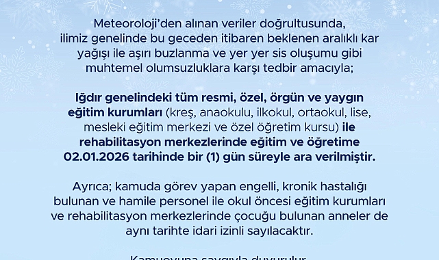 Meteoroloji Genel Müdürlüğü’nden alınan son değerlendirmelere göre, il genelinde etkili olması beklenen yoğun kar yağışı, buzlanma ve sis nedeniyle oluşabilecek olumsuzluklara karşı tedbir amacıyla 02 Ocak 2026 cuma günü Iğdır genelinde eğitime bir (1) gün süreyle ara verilmiştir.