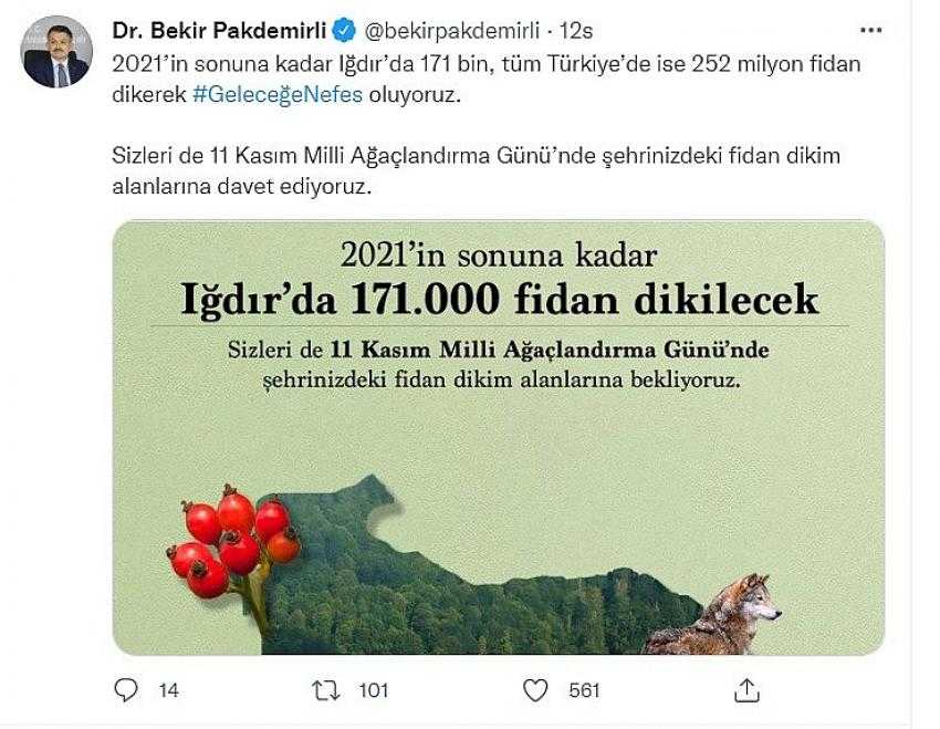 Tarım ve Orman Bakanı Bekir Pakdemirli, "2021'in sonuna kadar Iğdır’da 171 bin, tüm Türkiye'de ise 252 milyon fidan dikilecek" dedi.
